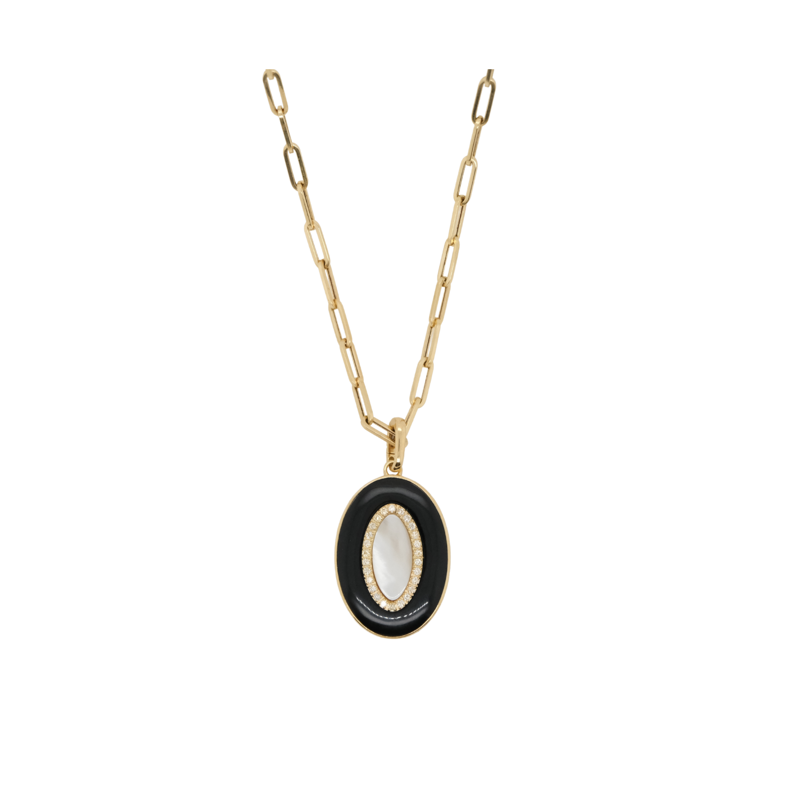 An opal and mother of pearl oval that plays with light and shadow. The Eclipse Necklace is a modern symbol of contrast, balance, and quiet drama.