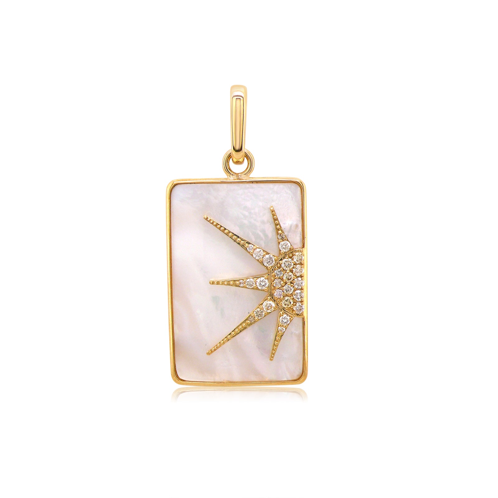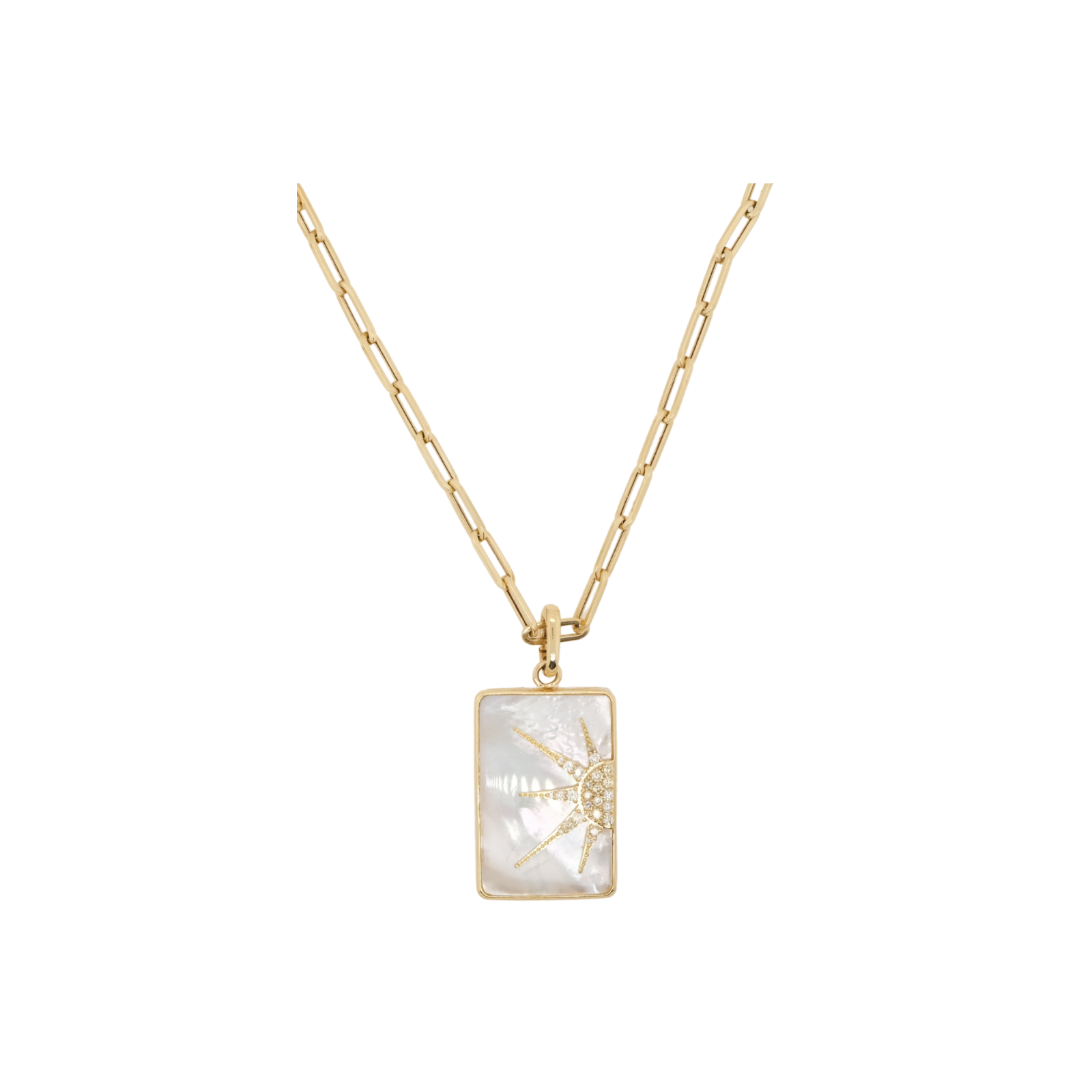 A radiant sun captured in shimmering mother of pearl. The Sol Necklace is a golden charm of light, warmth, and endless energy.